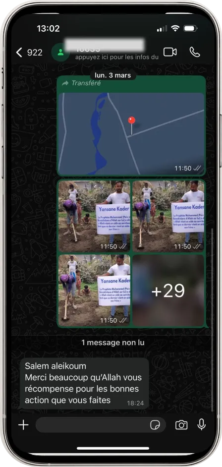 Chaque contribution financière est dédiée exclusivement à la construction de puits. Nous assurons une transparence totale en fournissant régulièrement des mises à jour et des photos détaillées à chaque étape de la construction du puits.