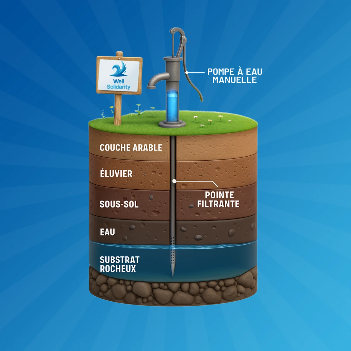 🛠️ Tubage perforé à pointe filtrante : le puits foncé repose sur un tube robuste, perforé et terminé par une pointe ; une crépine — fixée à l’extrémité — laisse passer l’eau tout en retenant les particules fines (sable, débris), garantissant une eau claire dès son captage.