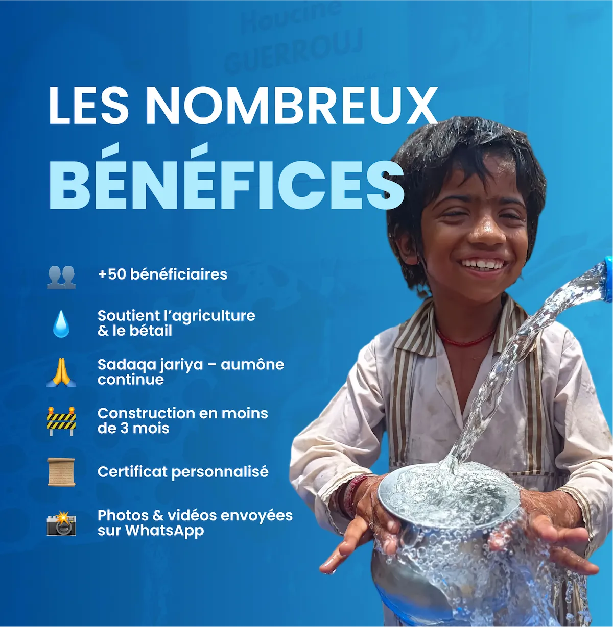 Construire un puits entre dans la catégorie de la charité continue, car il fournit une source d’eau durable et bénéfique pour les gens. Les enseignements islamiques mettent en avant l’importance de telles œuvres caritatives qui continuent de bénéficier à la communauté même après la mort du donateur.